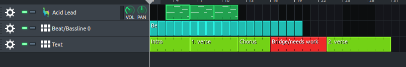 You could add a Beat/Bassline and use name on a block as text. I've used this for lyrics/notes. However It's limited to a single line. On the plus side you can change colours on the blocks.