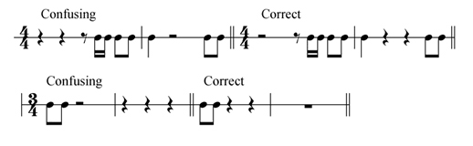 However that correct example, also conflicts in my head. It's 3/4, so only three notes will be played, in a count of four.
